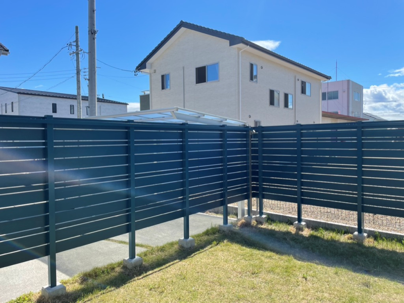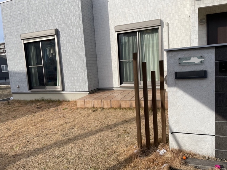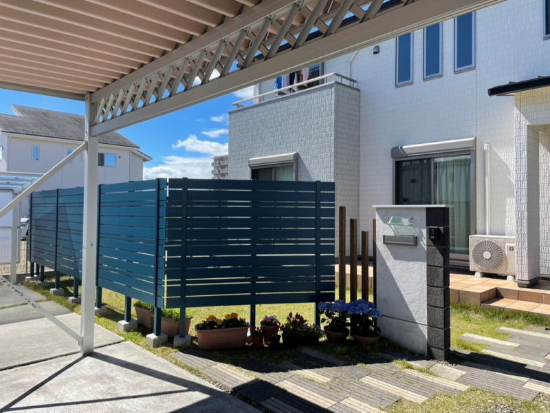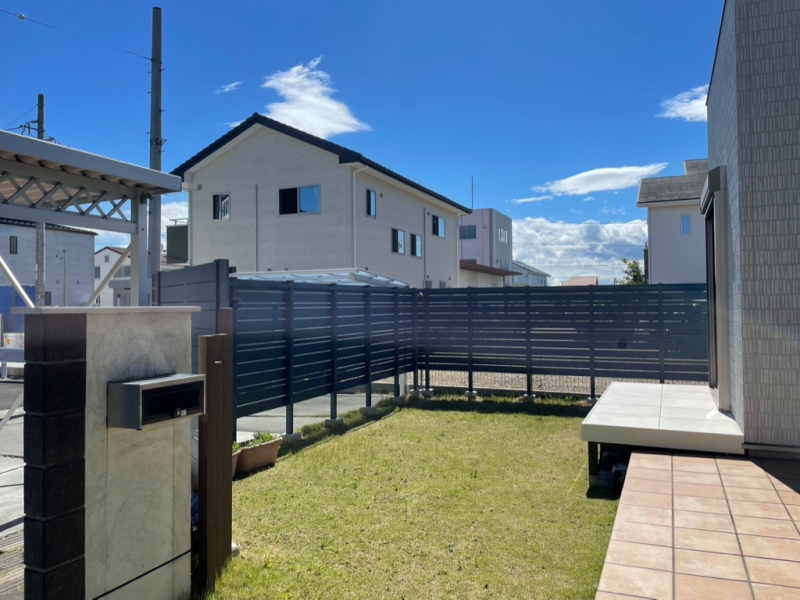 道路側には樹脂製の目隠しフェンスを設置しました。道路からの目線を和らげて、お庭をプライベートな場所にしてくれます。