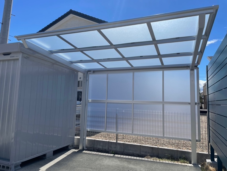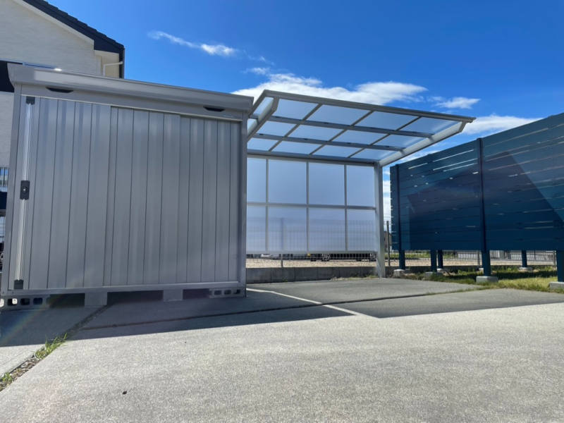 •ご要望のひとつであった物置は、お庭全体を広くご活用頂くためには、広い敷地内の駐車場スペースにご提案をさせて頂きました。