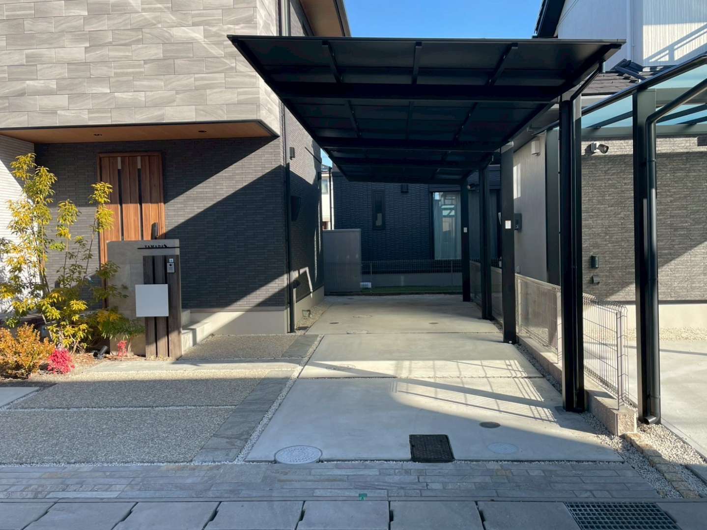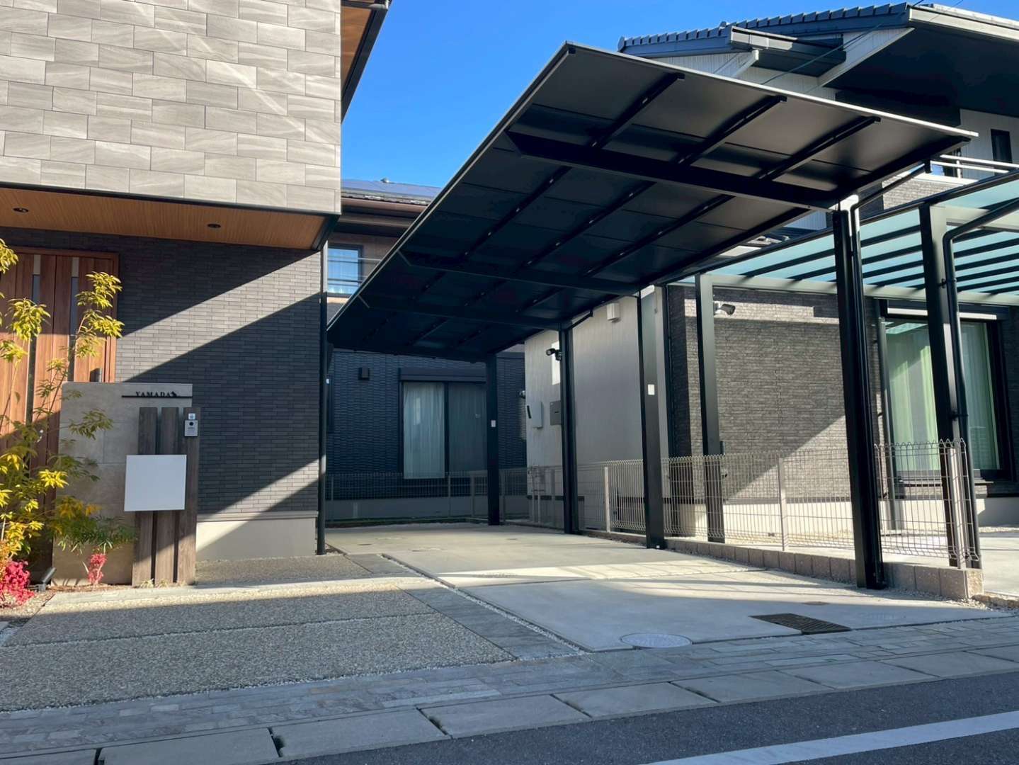 標準のクリアポリカ屋根から、落ち着いた印象のブラックポリカへご提案。外観が引き締まり、建物や外構との統一感が高まる仕上がりに。直射日光のまぶしさも軽減され、車への負担もやわらぎました。